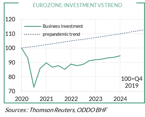 The pandemic led to a widespread lockdown, which in turn triggered the most severe recession in modern history. Admittedly, the rebound in activity was quick and massive once the health restrictions were lifted, but the European economy has yet to return to its pre-pandemic trajectory. As of early 2024, real GDP is 3.5% below what could have been projected by extending the trend in 2019. The level of investment spending is around 15 points below its trend (chart).