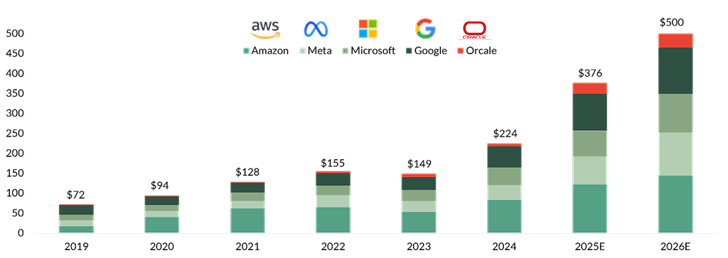 Graphique 2 : Dépenses d’investissement de Microsoft, Alphabet (Google), Amazon, Meta, Oracle en milliards de dollars américains